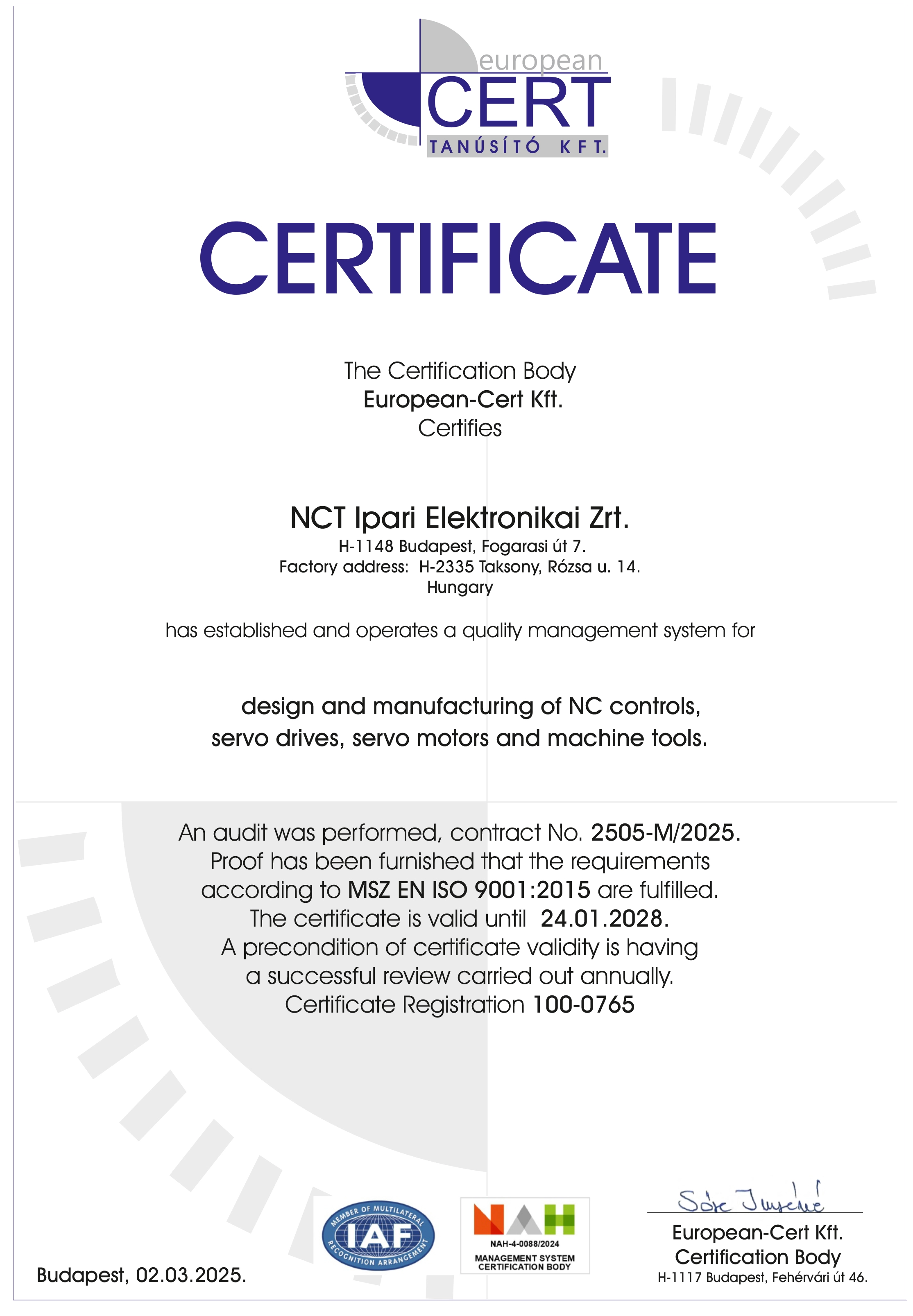 The certification guarantees our partners that NCT CNC controllers, machine tools, and industrial automation solutions are produced through reliable, controlled, and continuously improved processes.